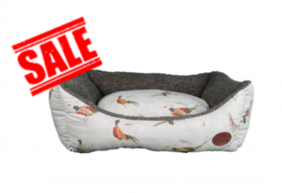 Pheasant Rectangular Bed S 64cm. Quality printed fabric with fleece lining. Reversible and removable inner pad. Filled with 100% Virgin Hollowfibre fibre. Removable Inner washable Cushion. Waterproof base.