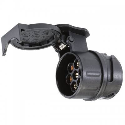 Converts 13-pin Euro socket on the major vehicle to the 7-pin plug on the trailer or caravan. Transfers the electronic signal lights from vehicle to towing. Weatherproof sprung locking socket cover protects the connections when not in use and locks the 7-pin plug when in use.