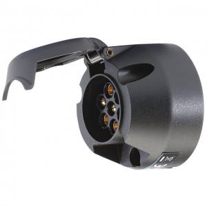 7-pin towing socket fitted with sprung loaded cover. The weatherproof sprung socket cover protects the connections when not in use and locks the 7-pin plug when in use.