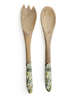 Serve up a feast with style using this handcrafted serving spoon and fork set, beautifully made from mango wood and adorned with a charming olives design. The intricate detailing of the olives motif enhances the warm, natural tones of the mango wood, lending a rustic yet whimsical touch to your dining experience.Perfect for salads, pasta dishes, or decorative pieces, these utensils are not only functional but also add a burst of colour and artisan charm to any table setting. Each piece is unique, highlighting the distinct grain patterns of the wood, making this set a delightful addition to any kitchen and a thoughtful gift for culinary enthusiasts.