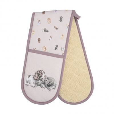 A wonderful addition to any kitchen, these fabulous oven gloves feature the 'A Dog's Life' design in a repeat pattern and a larger dog design on the mitts. Contrasting piped edging, a handy loop for hanging and towelling reverse mean these gloves are both stylish and practical. Outer 100% cotton, reverse high pile woven terry. Inner filling 100% polyester. Unfolded measures 890mm x 180mm. Machine washable. Plastic free packaging.