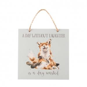 Get inspired with this fun wooden plaque featuring two artistically depicted foxes, the plaque reads 'A day without laughter is a day wasted'. With a coloured background and a contemporary look they are sure to stand out displayed around the home or would make a fabulous gift for someone special. Made from wood with a rustic jute hanger. 150mm x 150mm x 60mm.