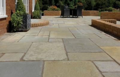 Tudor Antique paving features rounded corners and a smoother riven relief to the face, specifically to blend sympathetically with older properties and gardens where the design seeks to provide an established feel.