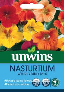 Unwins Nasturtium Whirlybird Mix Seeds create a supreme blend of upward-facing flowers. The flowers have beautiful shades of red, orange and peach that stand away from the foliage.