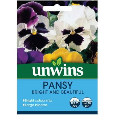 Unwins Pansy Bright and Beautiful Seeds produce a beautiful hardy biennial mix of large-flowered pansies.