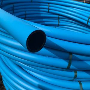 Solid wall 50mm blue MDPE (also known as alkathene) pipe coil suitable for below ground potable water mains supply distribution.
